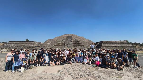 Nous avons visité Teotihuacán le jeudi 19, de 10 h à 18 h, dans le cadre de notre échange franco-mexicain. Nous étions un très grand groupe : environ 120 élèves, puisque chaque échange réunit dix Mexicains et dix Français, et que six classes préparatoires de l’Universidad Nacional Autónoma de México (UNAM) participaient également au projet. Cela donnait une ambiance très conviviale.